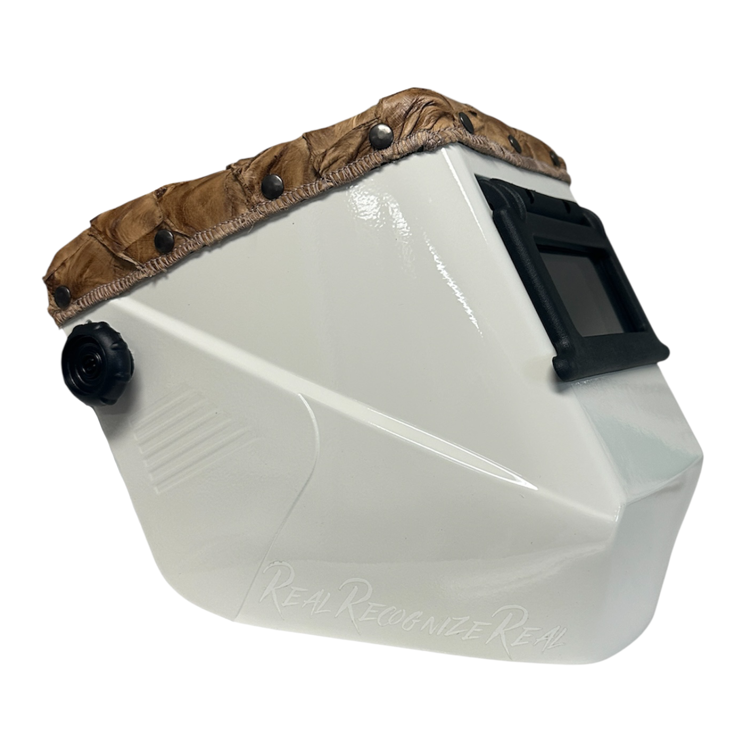 The Pirarucu Fish Leather "Jolly" Square Futura Welding Hood is a bold take on square welding hoods, blending premium leather craftsmanship with unique, standout style.