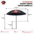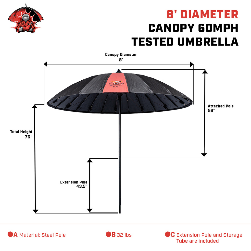 The 8 Foot Flame Resistant Umbrella includes an Extension Pole to extend the length and a Poly Storage tube for safekeeping when not in use.